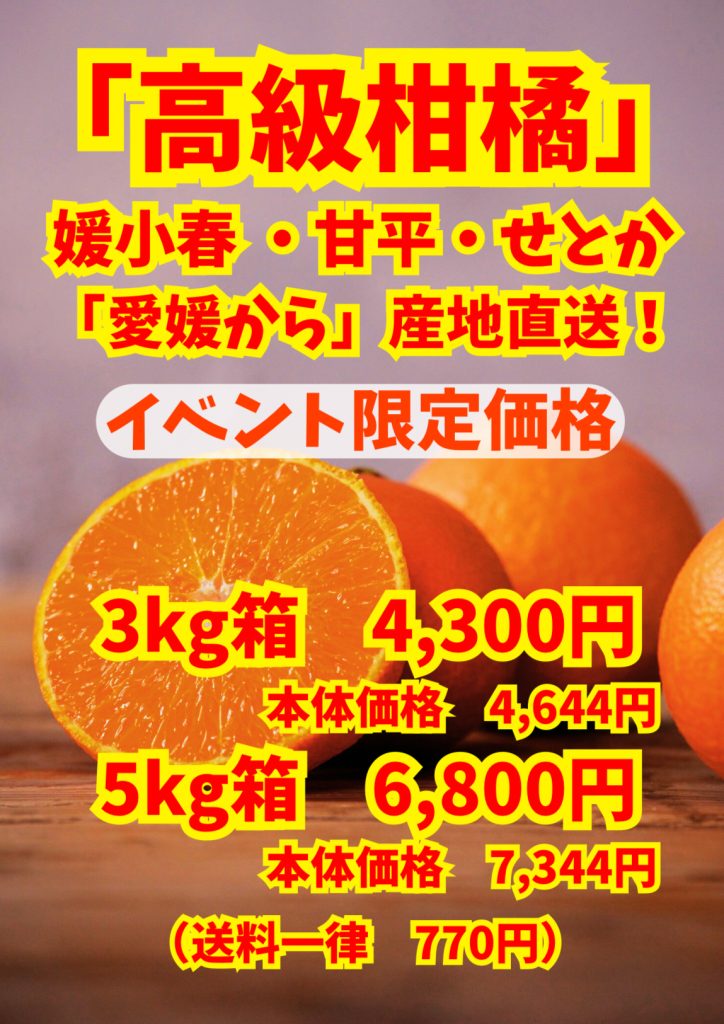 愛媛産の人気柑橘 「甘平・せとか・媛小春」 の予約注文を承ります。 愛媛から産地直送! 旬を迎える2月から3月にかけて、ご希望のご住所へご配送いたします。 日本の冬には、やっぱり愛媛のみかん! 産地直送の美味しい愛媛みかんをご用意して、 皆様のご来店をお待ちしております。